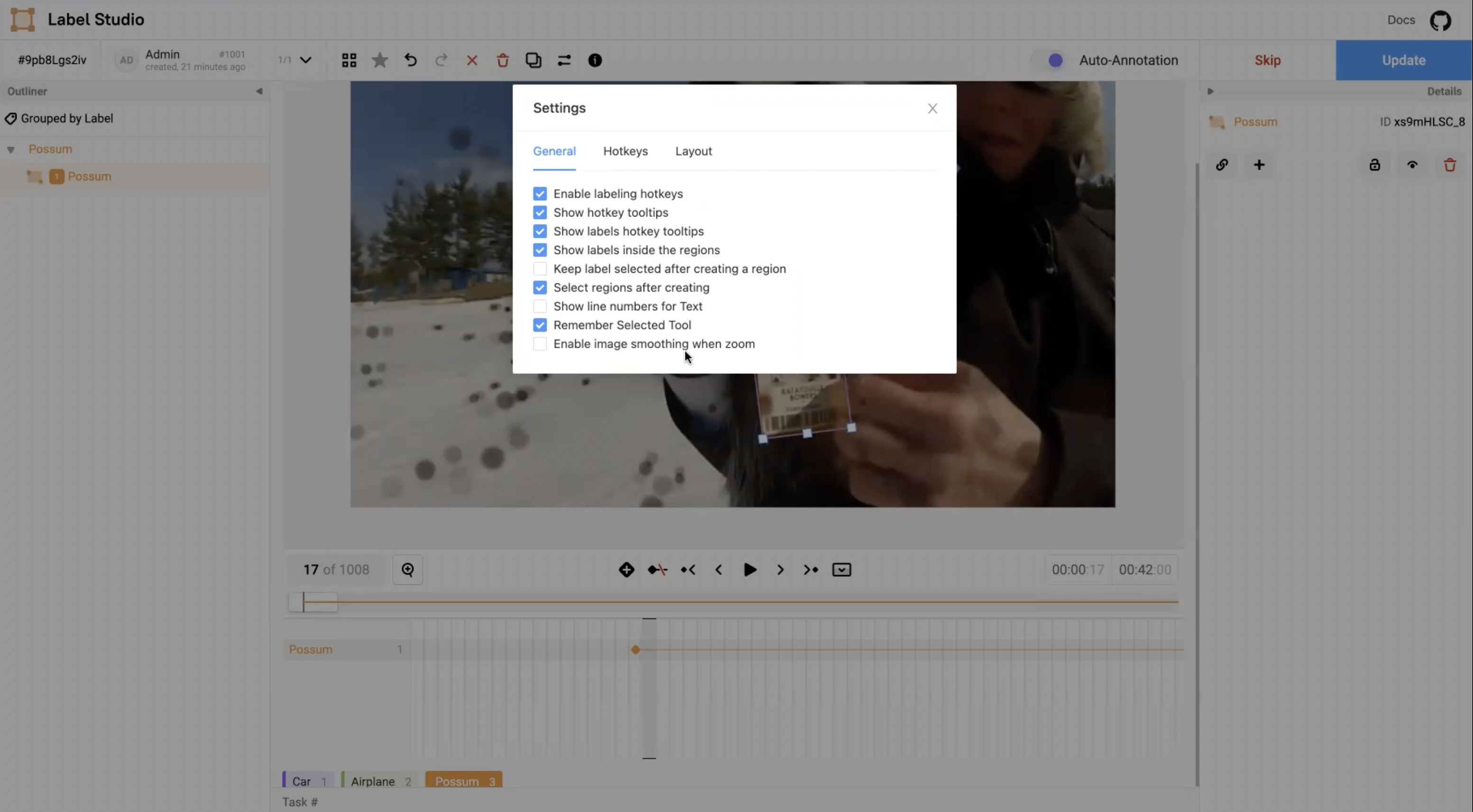 In the Label Studio UI, the video interface presents the main video canvas with controls that allows annotators to more precisely label blurry images using the following operations: